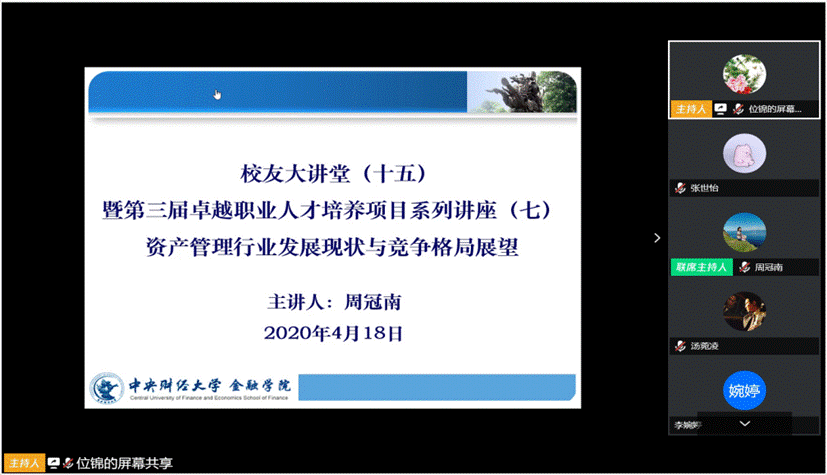 2020年4月18日下午,由bwin必赢官网职业发展中心举办的校友大讲堂(十五)暨第三届卓越职业人才培养项目系列讲座(七)——资产管理行业发展现状与竞争格局展望专题讲座成功举办。bwin必赢官网2007级金融学本科、2011级金融学硕校友,卓越职业人才培养项目导师,金融硕士研究生校外导师,华创证券固定收益首席分析师周冠南担任本次讲座的主讲嘉宾,第三届卓越职业人才培养项目成员及bwin必赢官网本、硕、博120余人共同参加。此次活动由bwin必赢官网职业发展中心老师位锦主持。