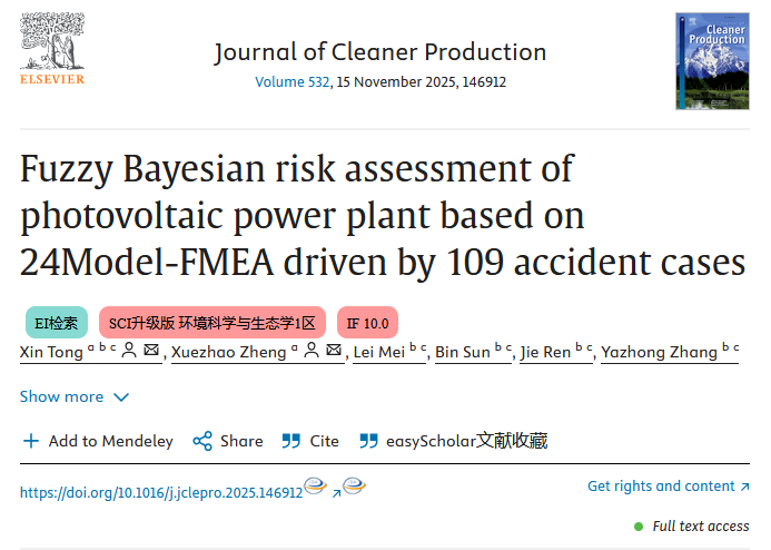 近日,beat365正版唯一官网应急管理系骨干教师童鑫在工程环境与可持续发展领域取得新突破,相关成果“Fuzzy Bayesian risk assessment of photovoltaic power plant based on 24Model-FMEA driven by 109 accident cases”发表于国际TOP期刊《Journal of Cleaner Production》。教师童鑫为论文的第一作者兼通讯作者。