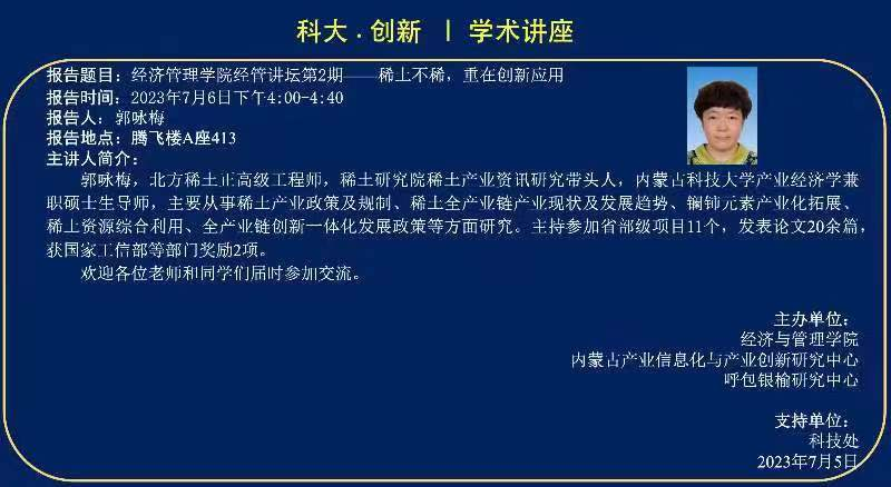 应beat365正版唯一官网邀请,7月6日下午北方稀土正高级工程师郭咏梅教授来访beat365正版唯一官网,面向全校做学术报告,报告由经管学院赵周华副院长主持召开。