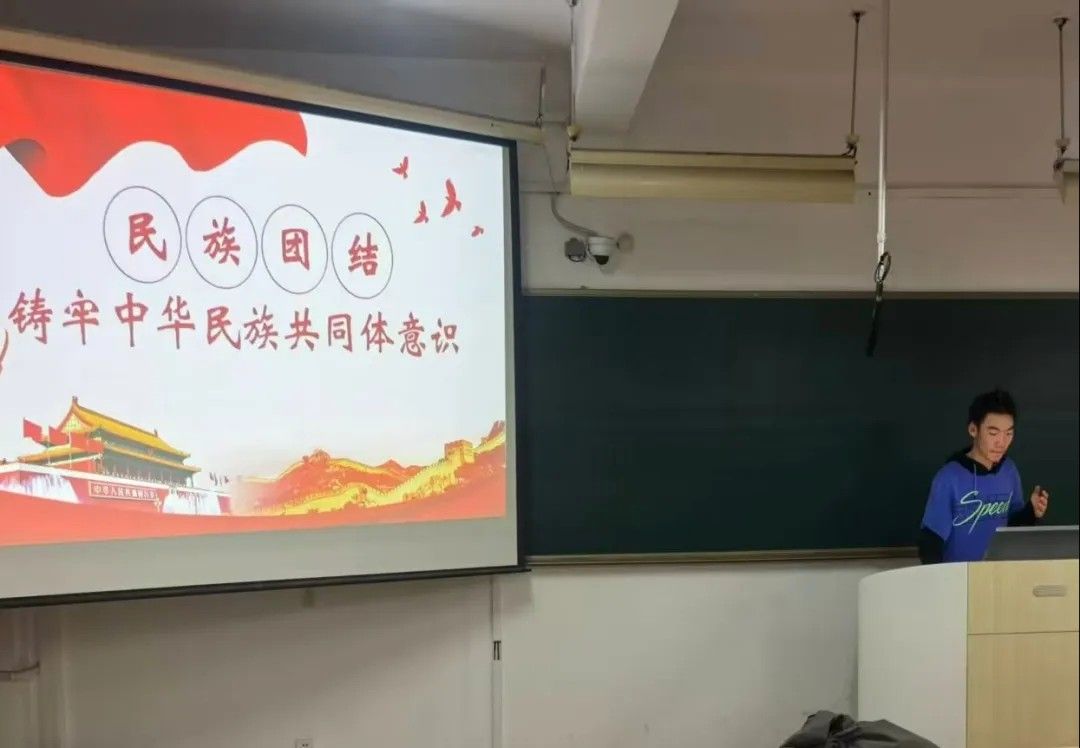 活动伊始,全体团员通过视频学习的方式系统深入了解我国统一多民族国家的基本国情,系统了解各民族交往交流交融的历史进程。随后,团支书围绕“共话五千年,传承根与魂”开展主题分享,结合民族交往融合的历史故事,从历史渊源、文化融合到新时代民族工作重点,生动阐释中华民族多元一体格局的深刻内涵,引导同学们树立正确的国家观、民族观、文化观。此外,现场设置了体验环节,团员们在沉浸式体验中,感受中华文化的厚重底蕴与多样性,体悟了“各美其美,美美与共”的底色。