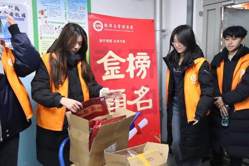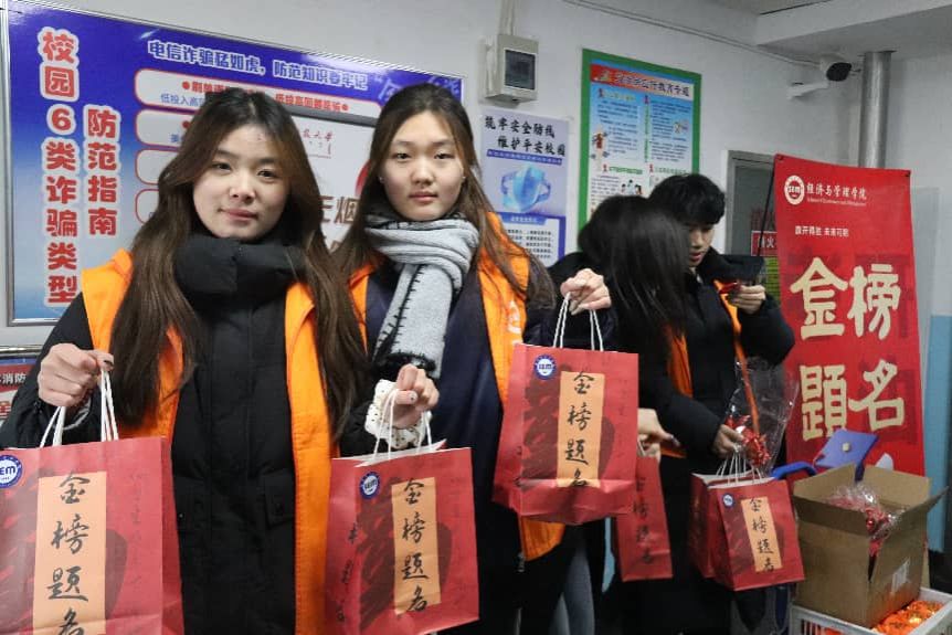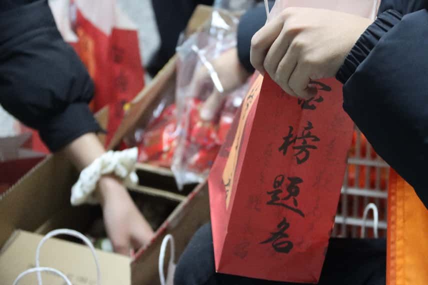 学院精心准备了饱含美好寓意的慰问礼品,象征“称心如意”的橙子、寓意“如你所愿”的薯片,与印有“逢考必胜”字样的棉花糖巧妙搭配,每一份红色礼盒不仅装载着水果与励志小物,更承载着学院对学子们最真挚的鼓励与期盼。