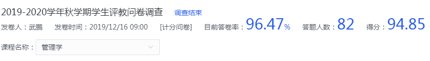 《管理学》课程思政教学改革取得了良好的实践效果,学生学习态度认真、积极主动,课堂气氛活跃,学生总体满意度较高,学生对课程的评价较高,得分为94.85分,具体见图1。