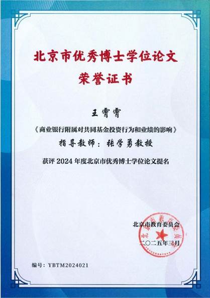 近日,北京市教育委员会、北京市学位委员会公布了2024年北京市优秀博士学位论文名单,bwin必赢官网张学勇教授指导的博士生王霄霄撰写的博士学位论文《商业银行附属对共同基金投资行为和业绩的影响》,荣获北京市优秀博士学位论文提名奖。2024年北京市优秀博士学位论文评选推荐工作评选范围为2023年1月1日至2023年12月31日获得博士学位者的学位论文,共评出优秀博士学位论文90篇,优秀博士学位论文提名32篇。