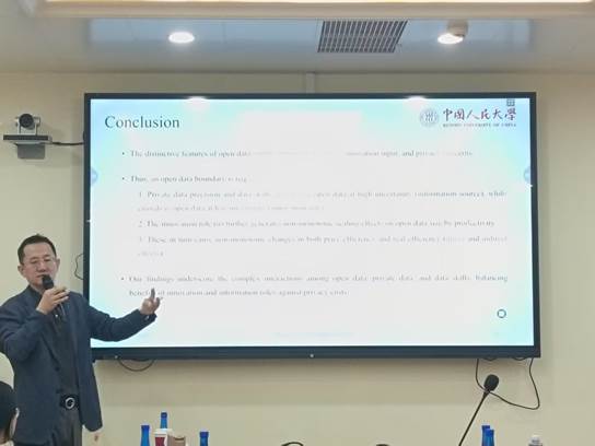 讲座伊始,邱志刚教授介绍自己关于数据经济的研究内容,主要分为数据生成、数据共享、数据交易与使用三部分。随后,邱志刚教授详细介绍本次研究的动机与理论模型。本次研究聚焦于探究开放数据的边界,已知开放数据具有两大属性,可公开获取性和非竞争性使用,两大属性使其发挥双重作用。开放数据边界与私有数据精度、数据技能水平及创新效应存在动态关联。其中,私有数据精度与数据技能的提升存在双重效应,在高不确定性环境下,私有数据更可能挤占开放数据(替代开放数据的信息源功能);在低不确定性环境下,私有数据会提升开放数据的创新赋能效果。开放数据通过直接路径(信息供给)和间接路径(创新激励)同时影响金融市场效能与实体经济运行效率。