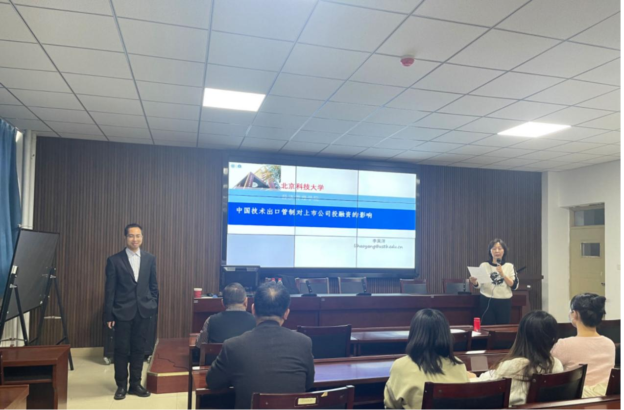 为营造优良学术氛围、夯实学生科研能力,beat365正版唯一官网于2023年12月15日下午2点30分举行第8期“经管讲堂”以“中国技术出口管制对上市公司投融资的影响”为主题的学术讲座,本次讲座由北京科技大学经济管理学院财务与会计系副教授、MPAcc项目负责人李昊洋老师主讲,经管学院MPAcc硕士点负责人魏曙光教授主持。参与本次讲座的有赵周华教授、郝婷副教授等经管学院老师以及全体会计硕士研究生。